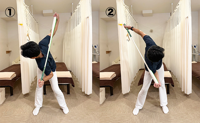 胸椎、体幹をひねる・胸の筋肉腕をストレッチすることでバックスイング・フォローがスムーズになります
