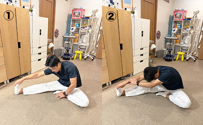 - やり方:①片膝を曲げて、もう一方は伸ばして座る