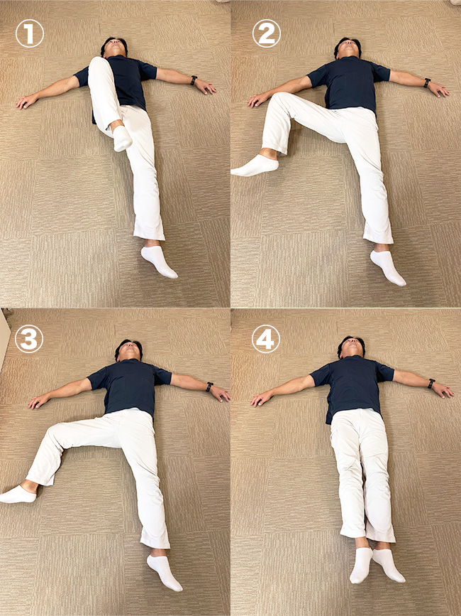 - やり方: 仰向けで両腕を広げ、片膝を反対側に倒す。腰と背中をひねる。
