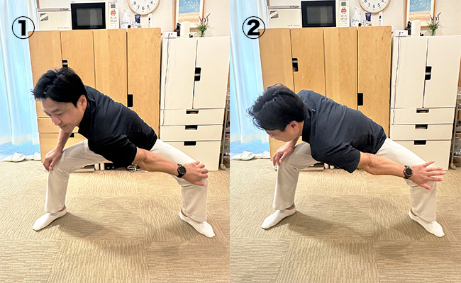 ①の写真のように膝に手をついたまま体を内側にひねります